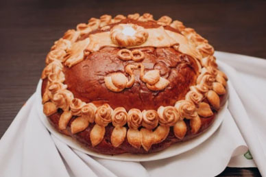 A wedding loaf is a special bread made according to special recipes for celebrations. It tastes great and looks luxurious at the same time. After cooking, such bread is decorated with special baked elements: viburnum leaves, wheat ears and two wedding rings. Viburnum leaves promise the continuation of the family, millet - prosperity and wealth, rings - the strength of marriage.